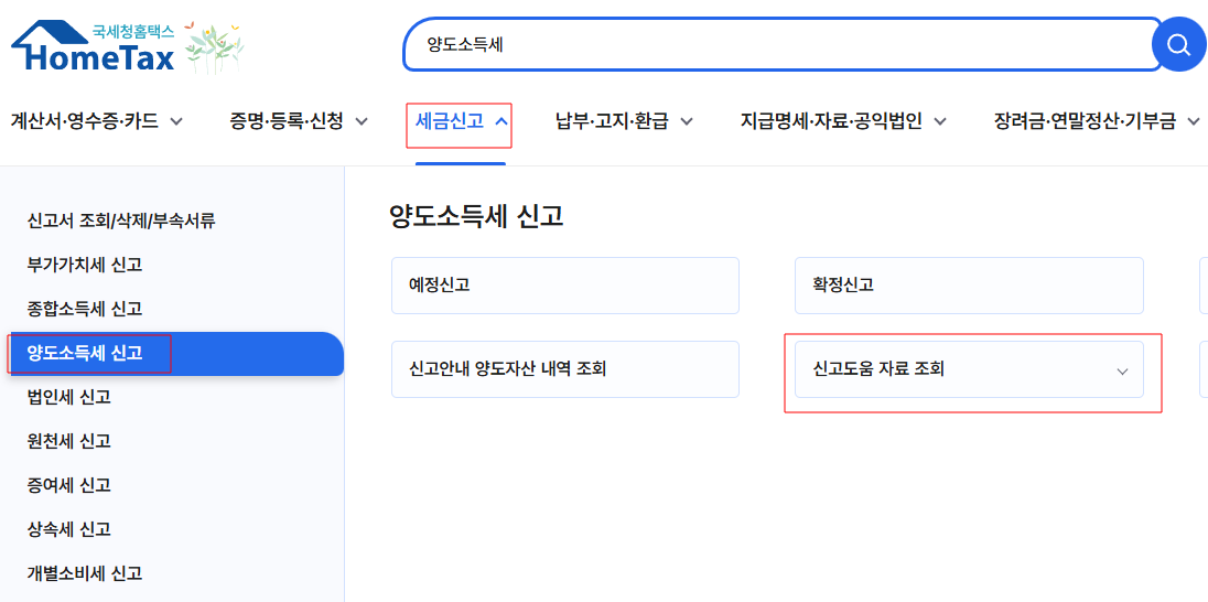 - 홈택스 경로: 세금신고 > 양도소득세 > 신고도움 자료 조회