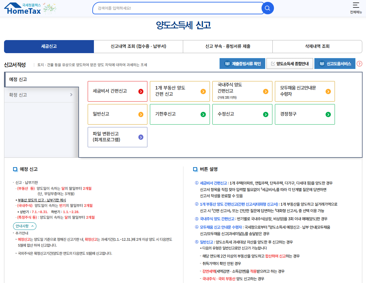 - 홈택스(PC) → 세금신고 → 양도소득세